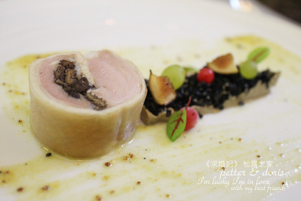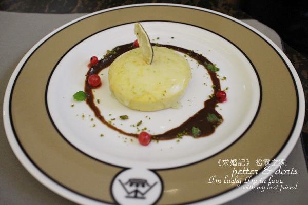 吃下去的時候,覺得口感很特別, 沒有想到松露跟焦糖烤布蕾合作的味道也挺搭的,松露的香氣味道滿重的!這是由法國名廚Francois Massialot法蘭斯瑪斯拉在1691發表。據說他為公爵用蛋黃與牛奶和麵粉做一個像卡士達的甜點,但是公爵希望可以再甜一點(跟我一樣),於是主廚就發明加糖再點火燃燒成金黃色的新甜點。而松露之家主廚個別在之中加入了白松露的香氣,入口即化的滑順口感,還帶濃濃的香草跟松露氣息,口感很特別!
