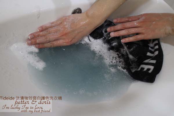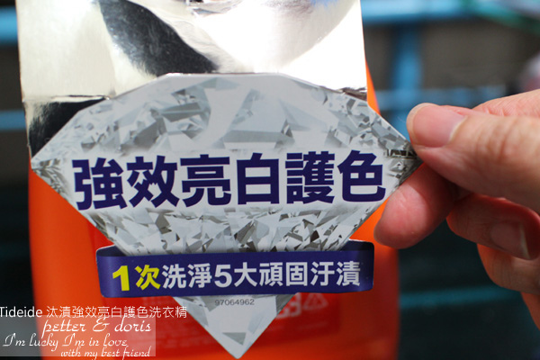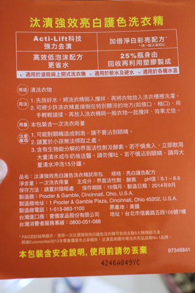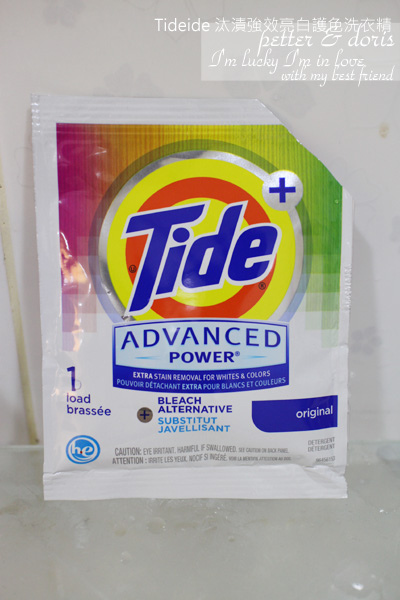 我拿出了《Tideide汰漬強效亮白護色洗衣精》試用包